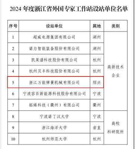 19th 12.2024 在全球化與科技創(chuàng)新的驅動下,浙江省外國專家工作站成為吸引國際高端人才、推動企業(yè)創(chuàng)新發(fā)展的重要平臺。自2020年《浙江省外國專家工作站管理辦法》實施以來,紹興市在吸引外籍專家方面取得了顯著成績。截至目前,紹興市已有6家單位獲批為省級外國專家工作站,位居全省前列。 2024年,浙江萬能彈簧機械有限公司榮...